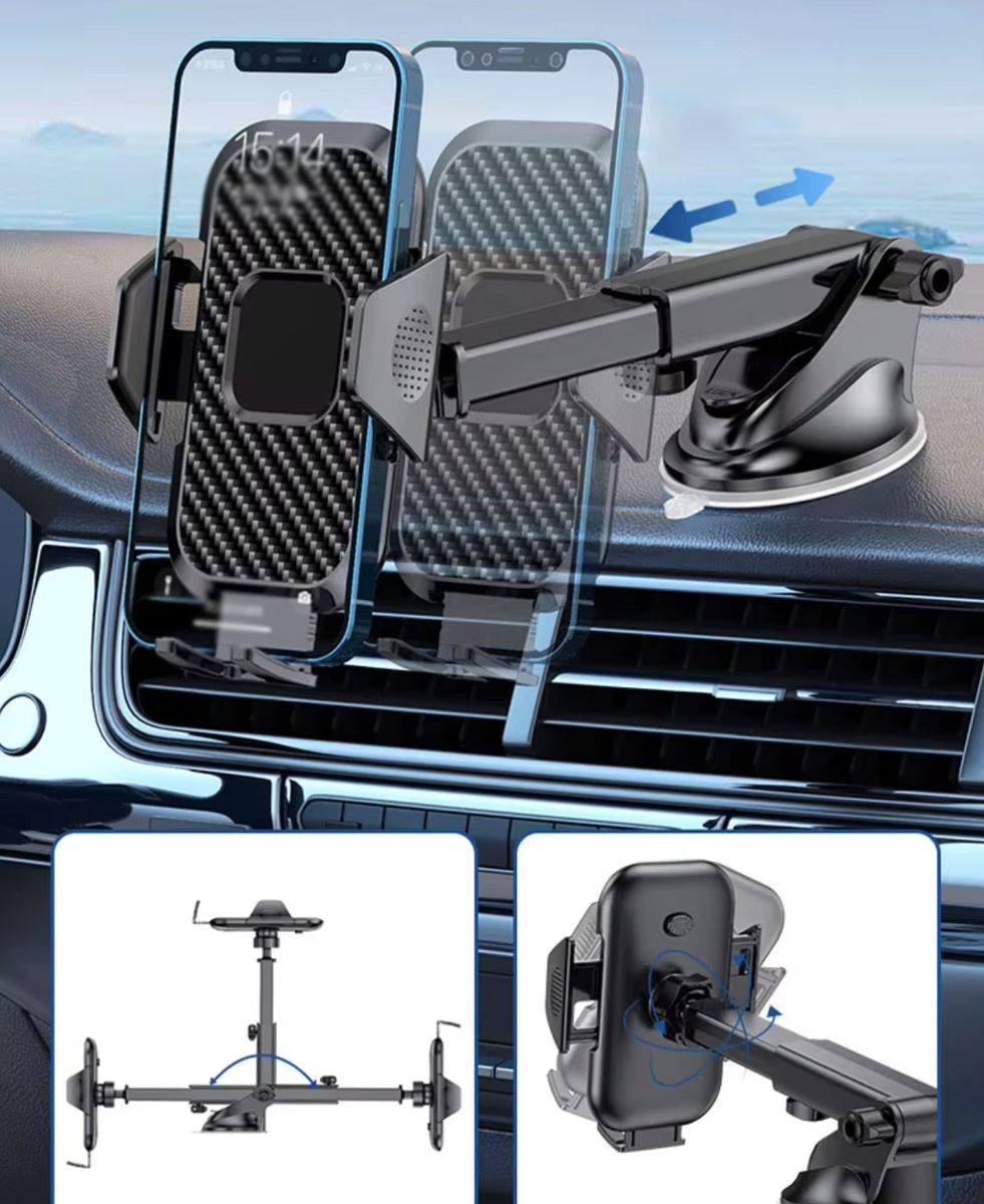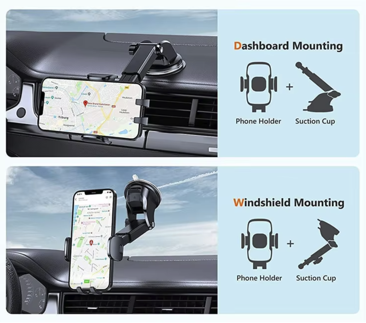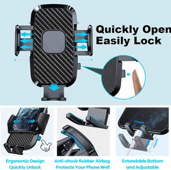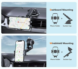 The 360 degrees ball joint and the adjustable telescopic.Arm make you able to adjust your phone to any angles and any places. Find a best view for your trip. You can use this mobile phone holder for car vertically or horizontally either, extremely flexible. That is convenient to navigate, pickup phone calls. Upgraded super strong stickiness suction cup, and 2-step lock mechanism provide extremely strong suction power. It can stay securely in the car. The extra dashboard pad, provides smooth surface. Cell Phone Holder for Car.Super wide arm enables this car cell phone holder mount to fit for all smart phones and thick cases.